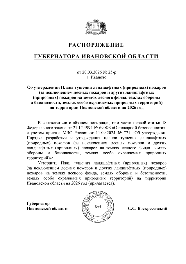 Распоряжение Губернатора Ивановской области от 20.03.2026 N 25-р "Об утверждении Плана тушения ландшафтных (природных) пожаров (за исключением лесных пожаров и других ландшафтных (природных) пожаров на землях лесного фонда, землях обороны и безопасности, землях особо охраняемых природных территорий) на территории Ивановской области на 2026 год"
