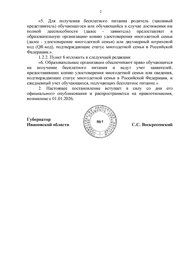 Постановление Правительства Ивановской области от 26.03.2026 N 100-п "О внесении изменений в постановление Правительства Ивановской области от 02.06.2025 N 203-п "Об установлении размера стоимости и утверждении Порядка предоставления бесплатного горячего питания детям из многодетных семей, обучающимся в 5 - 11 классах муниципальных общеобразовательных организаций и обучающимся по очной форме обучения в областных государственных профессиональных образовательных организациях"