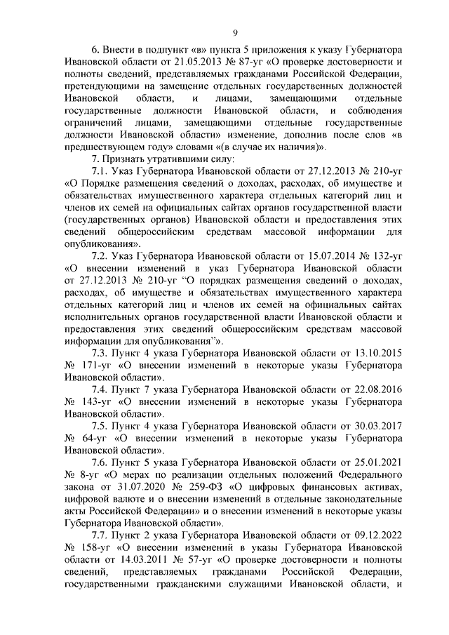 Указ Губернатора Ивановской области от 26.03.2026 N 26-уг "О внесении изменений в некоторые указы Губернатора Ивановской области и о признании утратившим силу указа Губернатора Ивановской области от 27.12.2013 N 210-уг "О Порядке размещения сведений о доходах, расходах, об имуществе и обязательствах имущественного характера отдельных категорий лиц и членов их семей на официальных сайтах органов государственной власти (государственных органов) Ивановской области и предоставления этих сведений общероссийским средствам массовой информации для опубликования"