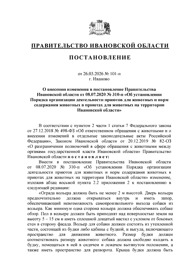 Постановление Правительства Ивановской области от 26.03.2026 N 101-п "О внесении изменения в постановление Правительства Ивановской области от 08.07.2020 N 310-п "Об установлении Порядка организации деятельности приютов для животных и норм содержания животных в приютах для животных на территории Ивановской области"