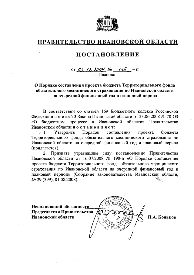 Постановление Правительства Ивановской области от 03.12.2009 N 335-п "О Порядке составления проекта бюджета Территориального фонда обязательного медицинского страхования по Ивановской области на очередной финансовый год и плановый период"