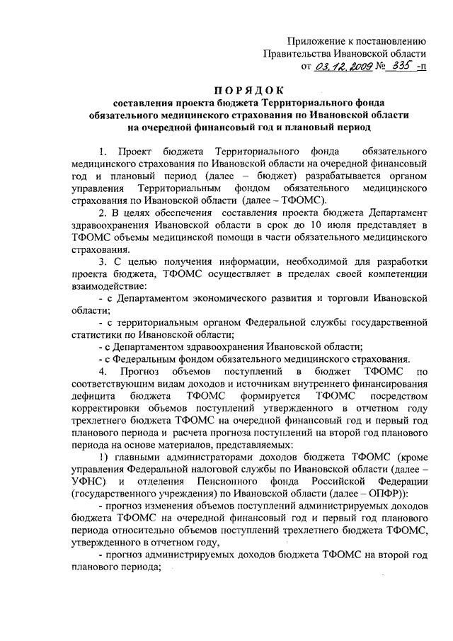 Постановление Правительства Ивановской области от 03.12.2009 N 335-п "О Порядке составления проекта бюджета Территориального фонда обязательного медицинского страхования по Ивановской области на очередной финансовый год и плановый период"