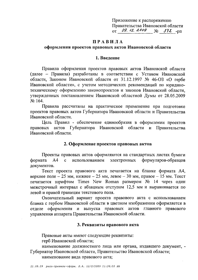 Распоряжение Правительства Ивановской области от 09.12.2009 N 372-рп "Об утверждении Правил оформления проектов правовых актов Ивановской области"