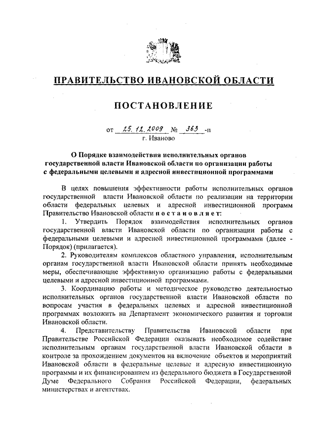 Постановление Правительства Ивановской области от 25.12.2009 N 363-п "О Порядке взаимодействия исполнительных органов государственной власти Ивановской области по организации работы с федеральными целевыми и адресной инвестиционной программами"