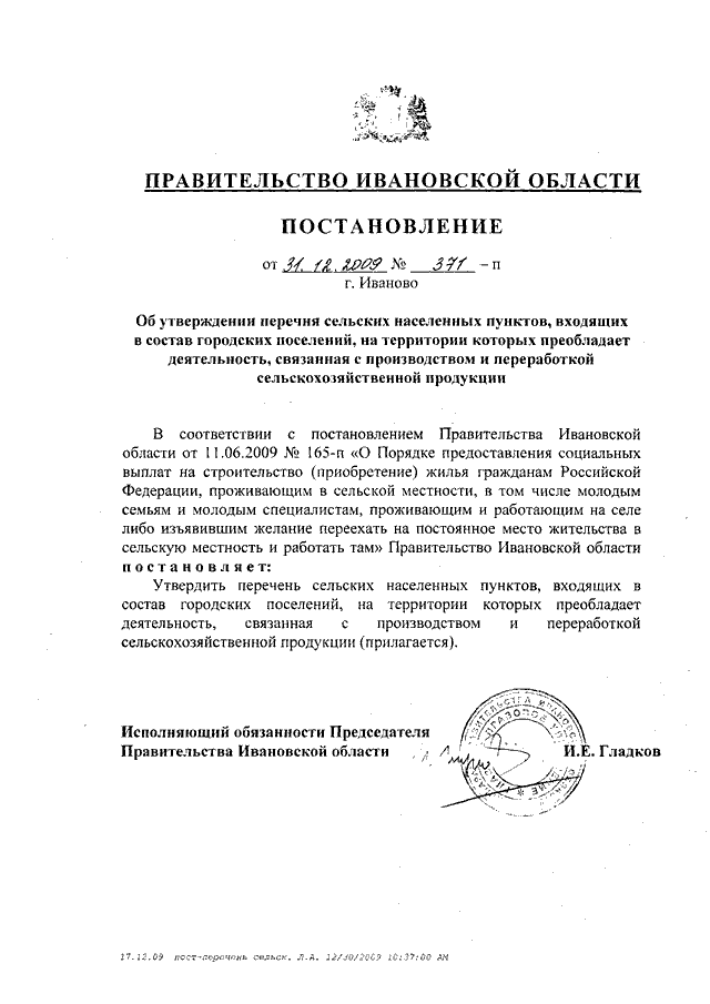 Постановление Правительства Ивановской области от 31.12.2009 N 371-п "Об утверждении перечня сельских населенных пунктов, входящих в состав городских поселений, на территории которых преобладает деятельность, связанная с производством и переработкой сельскохозяйственной продукции"