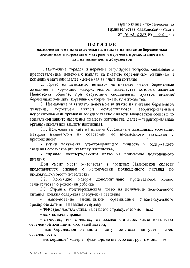 Постановление Правительства Ивановской области от 31.12.2009 N 380-п "Об утверждении порядка назначения и выплаты денежных выплат на питание беременным женщинам и кормящим матерям и перечня предоставляемых для их назначения документов"