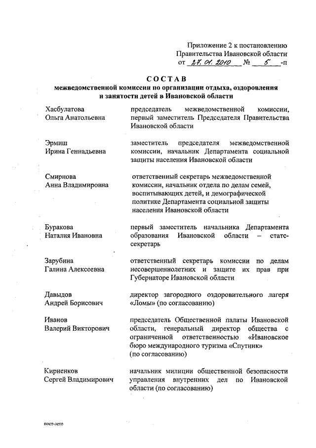 Постановление Правительства Ивановской области от 27.01.2010 N 5-п "Об обеспечении отдыха, оздоровления и занятости детей в Ивановской области в 2010 году" (вместе с "Порядком организации и обеспечения отдыха и оздоровления детей", "Положением о межведомственной комиссии по организации отдыха, оздоровления и занятости детей в Ивановской области", "Положением о межведомственной комиссии по приемке загородных оздоровительных лагерей, санаторно-оздоровительных лагерей круглогодичного действия и контролю за соблюдением данными организациями требований стандартов качества государственных услуг")
