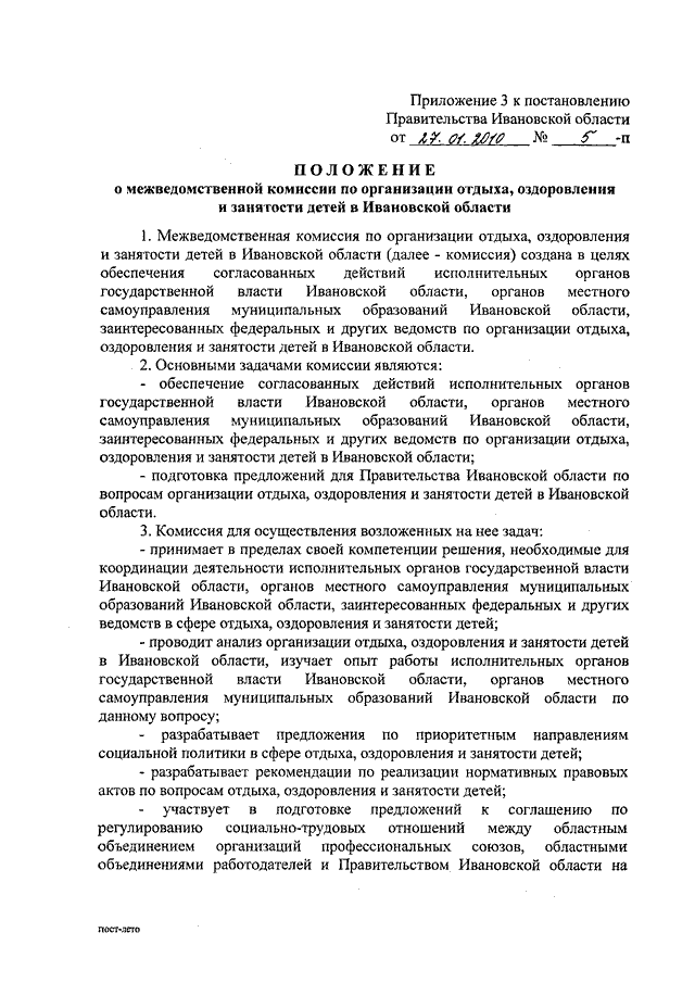Постановление Правительства Ивановской области от 27.01.2010 N 5-п "Об обеспечении отдыха, оздоровления и занятости детей в Ивановской области в 2010 году" (вместе с "Порядком организации и обеспечения отдыха и оздоровления детей", "Положением о межведомственной комиссии по организации отдыха, оздоровления и занятости детей в Ивановской области", "Положением о межведомственной комиссии по приемке загородных оздоровительных лагерей, санаторно-оздоровительных лагерей круглогодичного действия и контролю за соблюдением данными организациями требований стандартов качества государственных услуг")