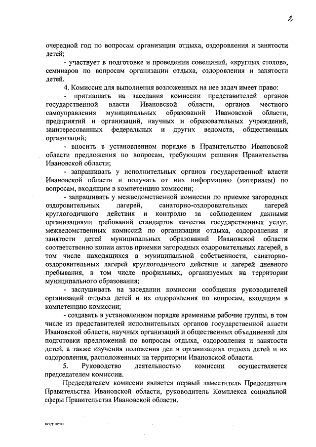 Постановление Правительства Ивановской области от 27.01.2010 N 5-п "Об обеспечении отдыха, оздоровления и занятости детей в Ивановской области в 2010 году" (вместе с "Порядком организации и обеспечения отдыха и оздоровления детей", "Положением о межведомственной комиссии по организации отдыха, оздоровления и занятости детей в Ивановской области", "Положением о межведомственной комиссии по приемке загородных оздоровительных лагерей, санаторно-оздоровительных лагерей круглогодичного действия и контролю за соблюдением данными организациями требований стандартов качества государственных услуг")
