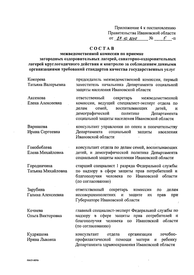 Постановление Правительства Ивановской области от 27.01.2010 N 5-п "Об обеспечении отдыха, оздоровления и занятости детей в Ивановской области в 2010 году" (вместе с "Порядком организации и обеспечения отдыха и оздоровления детей", "Положением о межведомственной комиссии по организации отдыха, оздоровления и занятости детей в Ивановской области", "Положением о межведомственной комиссии по приемке загородных оздоровительных лагерей, санаторно-оздоровительных лагерей круглогодичного действия и контролю за соблюдением данными организациями требований стандартов качества государственных услуг")
