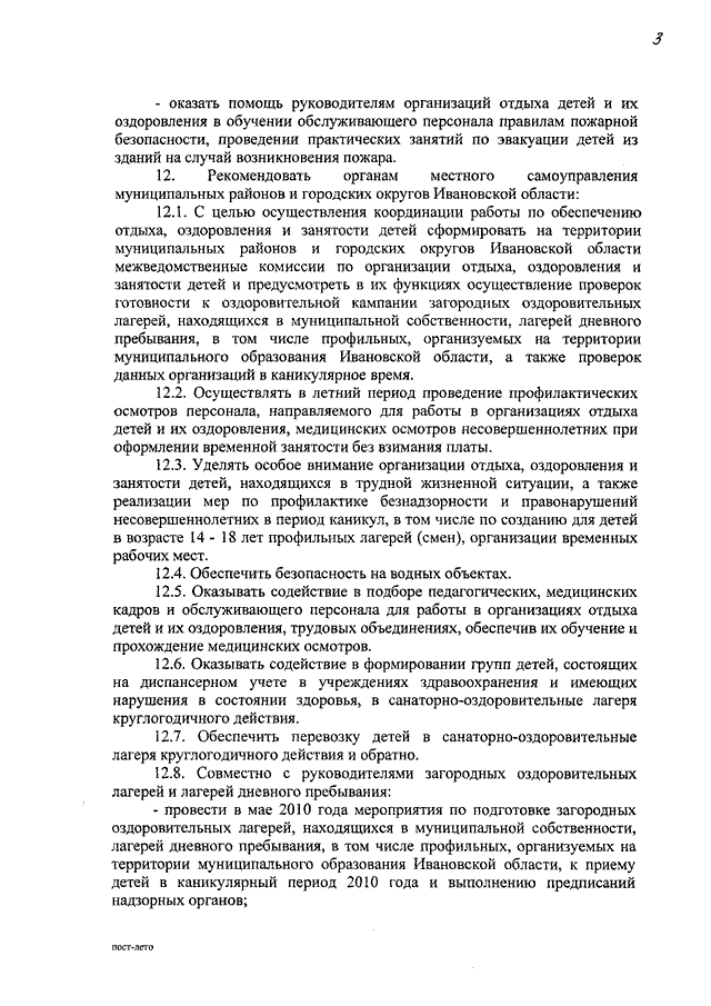 Постановление Правительства Ивановской области от 27.01.2010 N 5-п "Об обеспечении отдыха, оздоровления и занятости детей в Ивановской области в 2010 году" (вместе с "Порядком организации и обеспечения отдыха и оздоровления детей", "Положением о межведомственной комиссии по организации отдыха, оздоровления и занятости детей в Ивановской области", "Положением о межведомственной комиссии по приемке загородных оздоровительных лагерей, санаторно-оздоровительных лагерей круглогодичного действия и контролю за соблюдением данными организациями требований стандартов качества государственных услуг")