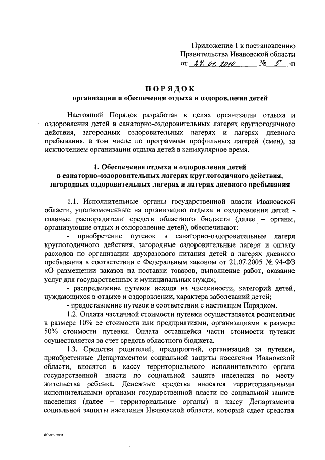 Постановление Правительства Ивановской области от 27.01.2010 N 5-п "Об обеспечении отдыха, оздоровления и занятости детей в Ивановской области в 2010 году" (вместе с "Порядком организации и обеспечения отдыха и оздоровления детей", "Положением о межведомственной комиссии по организации отдыха, оздоровления и занятости детей в Ивановской области", "Положением о межведомственной комиссии по приемке загородных оздоровительных лагерей, санаторно-оздоровительных лагерей круглогодичного действия и контролю за соблюдением данными организациями требований стандартов качества государственных услуг")