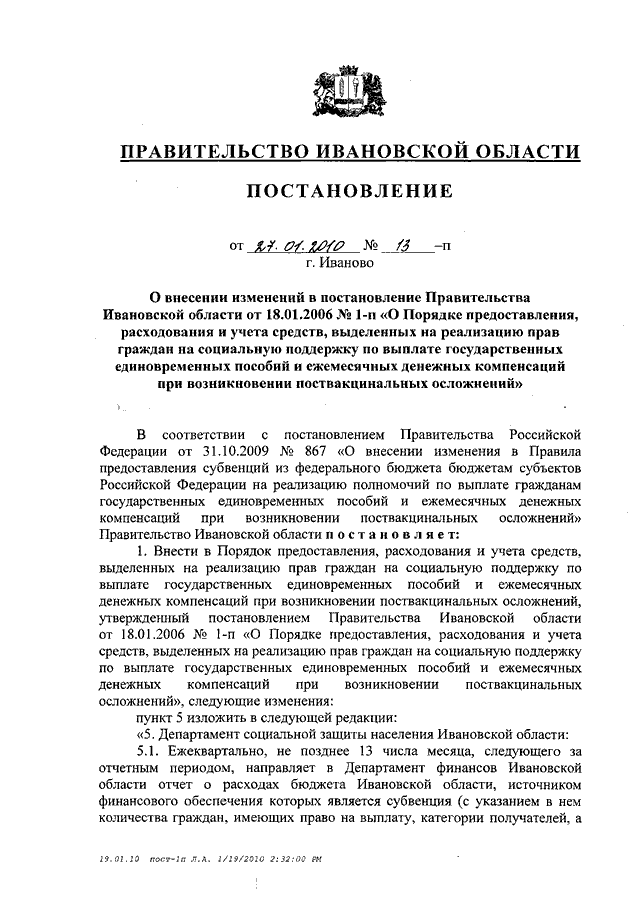 Постановление Правительства Ивановской области от 27.01.2010 N 13-п "О внесении изменений в постановление Правительства Ивановской области от 18.01.2006 N 1-п "О Порядке предоставления, расходования и учета средств, выделенных на реализацию прав граждан на социальную поддержку по выплате государственных единовременных пособий и ежемесячных денежных компенсаций при возникновении поствакцинальных осложнений"