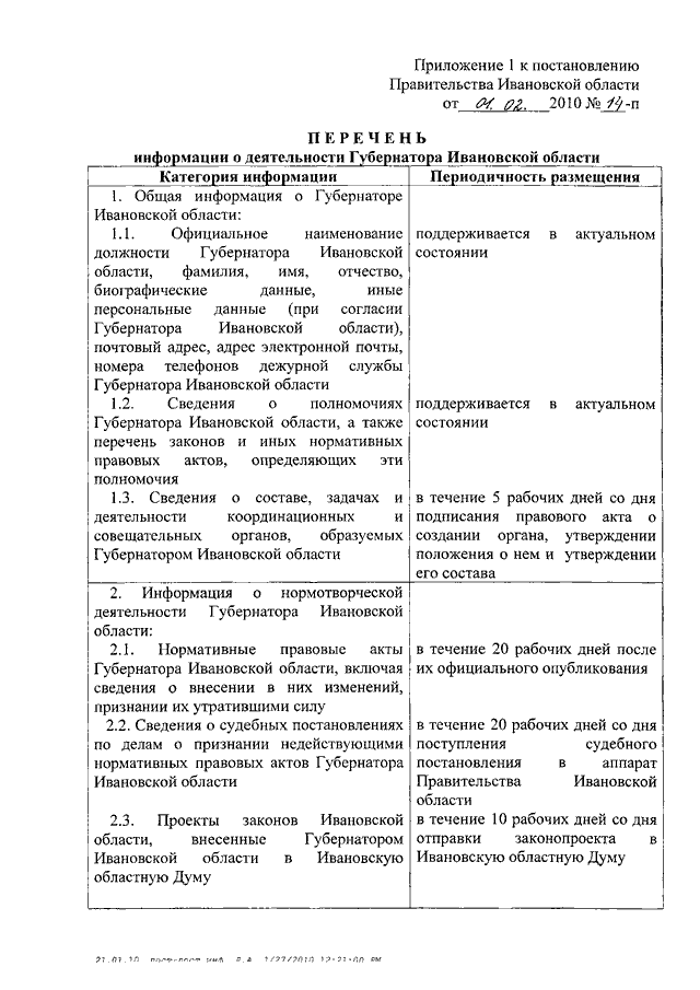 Постановление Правительства Ивановской области от 01.02.2010 N 14-п "Об обеспечении доступа к информации о деятельности Губернатора Ивановской области и Правительства Ивановской области" (вместе с "Перечнем информации о деятельности Губернатора Ивановской области", "Перечнем информации о деятельности Правительства Ивановской области")