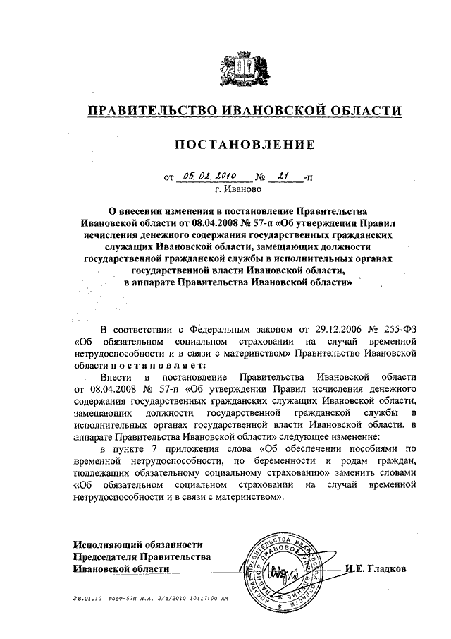 Постановление Правительства Ивановской области от 05.02.2010 N 21-п "О внесении изменения в постановление Правительства Ивановской области от 08.04.2008 N 57-п "Об утверждении Правил исчисления денежного содержания государственных гражданских служащих Ивановской области, замещающих должности государственной гражданской службы в исполнительных органах государственной власти Ивановской области, в аппарате Правительства Ивановской области"