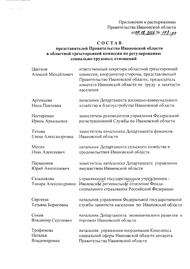Распоряжение Правительства Ивановской области от 09.08.2006 N 178-рп "Об утверждении состава представителей Правительства Ивановской области в областной трехсторонней комиссии по регулированию социально-трудовых отношений"