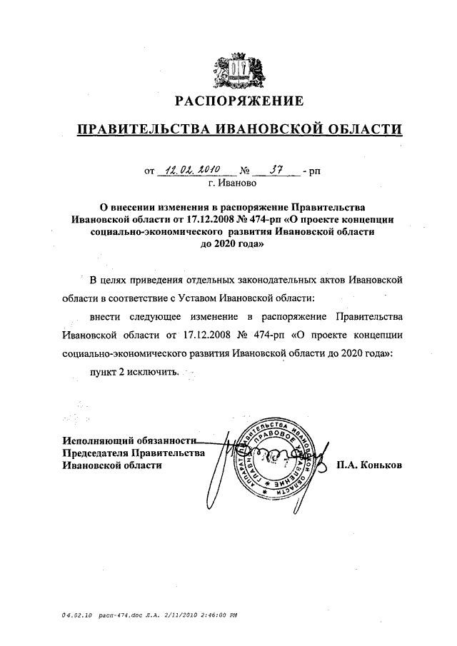 Распоряжение Правительства Ивановской области от 12.02.2010 N 37-рп "О внесении изменения в распоряжение Правительства Ивановской области от 17.12.2008 N 474-рп "О проекте концепции социально-экономического развития Ивановской области до 2020 года"