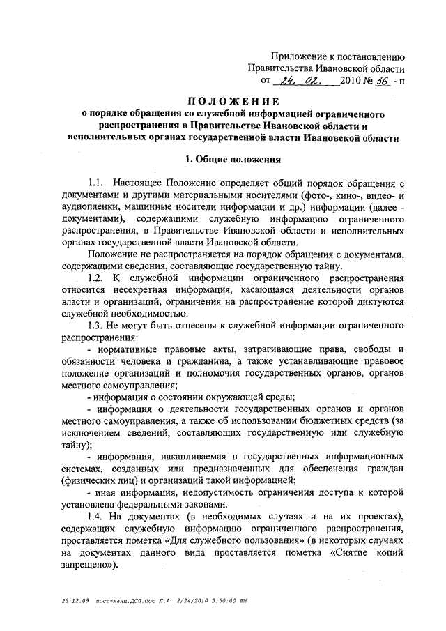 Постановление Правительства Ивановской области от 24.02.2010 N 36-п "Об утверждении Положения о порядке обращения со служебной информацией ограниченного распространения в Правительстве Ивановской области и исполнительных органах государственной власти Ивановской области"