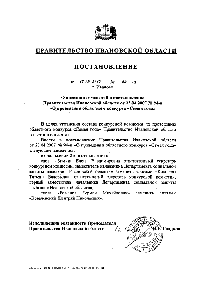 Постановление Правительства Ивановской области от 17.03.2010 N 63-п "О внесении изменений в постановление Правительства Ивановской области от 23.04.2007 N 94-п "О проведении областного конкурса "Семья года"
