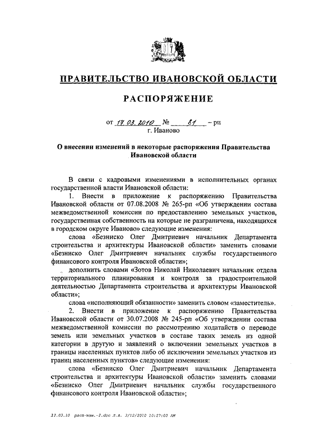 Распоряжение Правительства Ивановской области от 17.03.2010 N 81-рп "О внесении изменений в некоторые распоряжения Правительства Ивановской области"