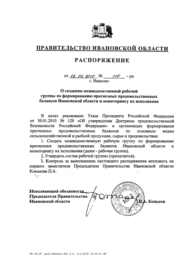 Распоряжение Правительства Ивановской области от 02.04.2010 N 110-рп "О создании межведомственной рабочей группы по формированию прогнозных продовольственных балансов Ивановской области и мониторингу их исполнения"