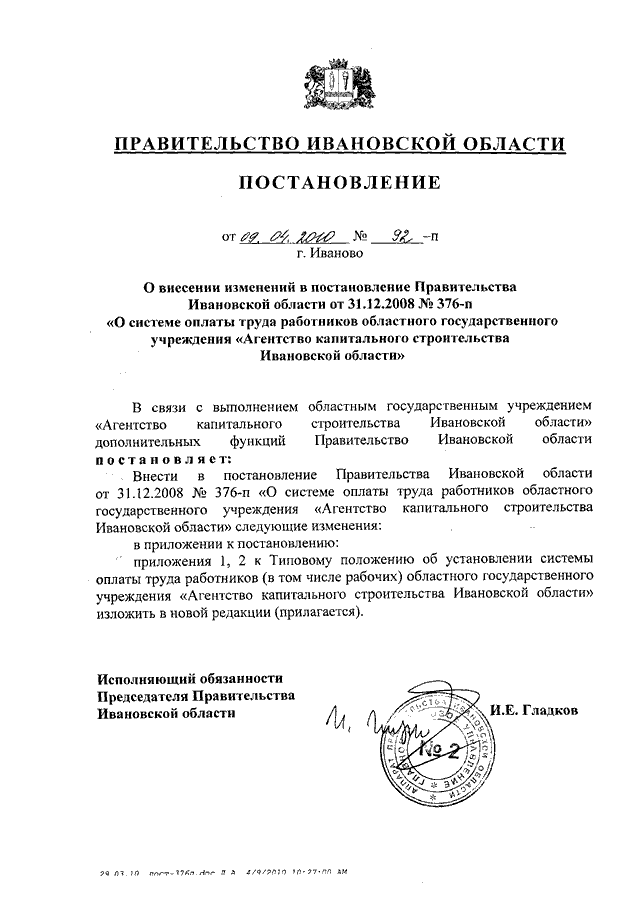 Постановление Правительства Ивановской области от 09.04.2010 N 92-п "О внесении изменений в постановление Правительства Ивановской области от 31.12.2008 N 376-п "О системе оплаты труда работников областного государственного учреждения "Агентство капитального строительства Ивановской области"