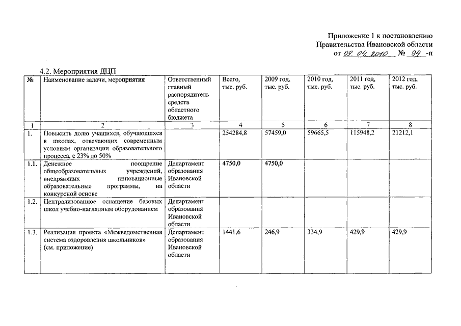 Постановление Правительства Ивановской области от 09.04.2010 N 94-п "О внесении изменений в постановление Правительства Ивановской области от 19.09.2008 N 243-п "Об утверждении долгосрочной целевой программы Ивановской области "Развитие общего образования Ивановской области на 2009 - 2012 годы" (вместе с "Проектом "Создание региональной системы оценки качества образования")