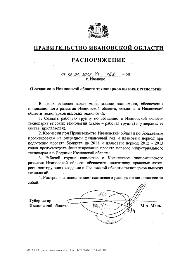Распоряжение Правительства Ивановской области от 13.04.2010 N 122-рп "О создании в Ивановской области технопарков высоких технологий"