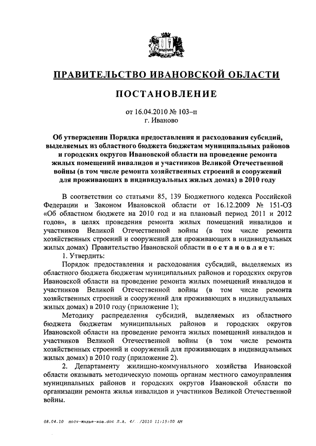 Постановление Правительства Ивановской области от 16.04.2010 N 103-п "Об утверждении Порядка предоставления и расходования субсидий, выделяемых из областного бюджета бюджетам муниципальных районов и городских округов Ивановской области на проведение ремонта жилых помещений инвалидов и участников Великой Отечественной войны (в том числе ремонта хозяйственных строений и сооружений для проживающих в индивидуальных жилых домах) в 2010 году" (вместе с "Методикой распределения субсидий, выделяемых из областного бюджета бюджетам муниципальных районов и городских округов Ивановской области на проведение ремонта жилых помещений инвалидов и участников Великой Отечественной войны (в том числе ремонта хозяйственных строений и сооружений для проживающих в индивидуальных жилых домах) в 2010 году")