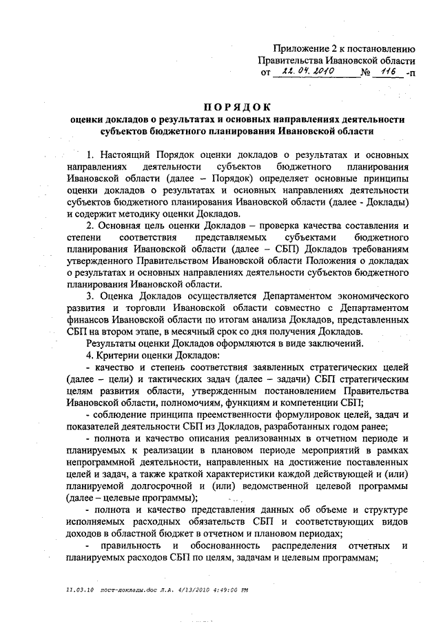 Постановление Правительства Ивановской области от 22.04.2010 N 116-п "О докладах о результатах и основных направлениях деятельности субъектов бюджетного планирования Ивановской области" (вместе с "Положением о докладах о результатах и основных направлениях деятельности субъектов бюджетного планирования Ивановской области", "Порядком оценки докладов о результатах и основных направлениях деятельности субъектов бюджетного планирования Ивановской области")