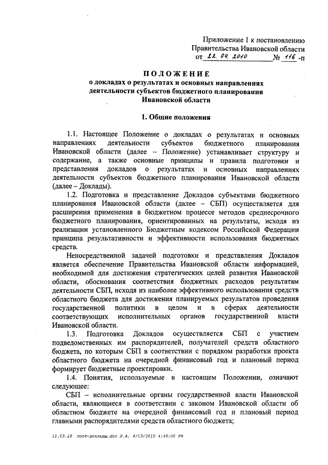 Постановление Правительства Ивановской области от 22.04.2010 N 116-п "О докладах о результатах и основных направлениях деятельности субъектов бюджетного планирования Ивановской области" (вместе с "Положением о докладах о результатах и основных направлениях деятельности субъектов бюджетного планирования Ивановской области", "Порядком оценки докладов о результатах и основных направлениях деятельности субъектов бюджетного планирования Ивановской области")