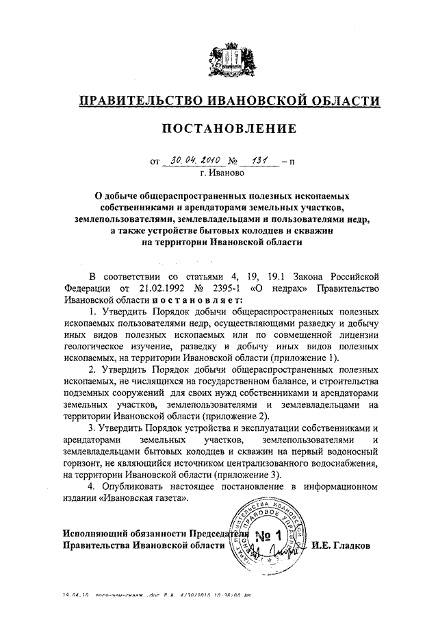 Постановление Правительства Ивановской области от 30.04.2010 N 131-п "О добыче общераспространенных полезных ископаемых собственниками и арендаторами земельных участков, землепользователями, землевладельцами и пользователями недр, а также устройстве бытовых колодцев и скважин на территории Ивановской области" (вместе с "Порядком добычи общераспространенных полезных ископаемых пользователями недр, осуществляющими разведку и добычу иных видов полезных ископаемых или по совмещенной лицензии геологическое изучение, разведку и добычу иных видов полезных ископаемых, на территории Ивановской области", "Порядком добычи общераспространенных полезных ископаемых, не числящихся на государственном балансе, и строительства подземных сооружений для своих нужд собственниками и арендаторами земельных участков, землепользователями и землевладельцами на территории Ивановской области", "Порядком устройства и эксплуатации собственниками и арендаторами земельных участков, землепользователями и землевладельцами бытовых колодцев и скважин на первый водоносный горизонт, не являющийся источником централизованного водоснабжения, на территории Ивановской области")