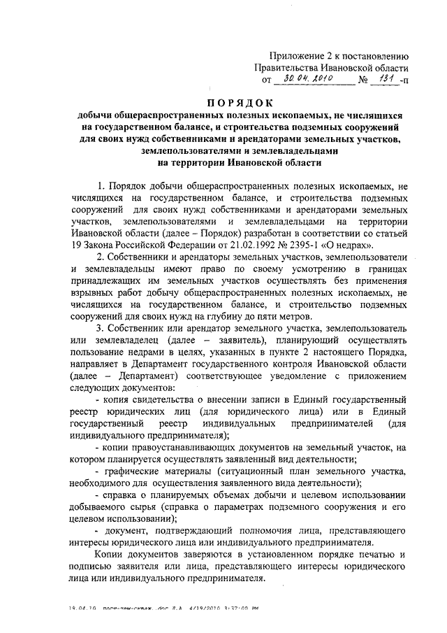 Постановление Правительства Ивановской области от 30.04.2010 N 131-п "О добыче общераспространенных полезных ископаемых собственниками и арендаторами земельных участков, землепользователями, землевладельцами и пользователями недр, а также устройстве бытовых колодцев и скважин на территории Ивановской области" (вместе с "Порядком добычи общераспространенных полезных ископаемых пользователями недр, осуществляющими разведку и добычу иных видов полезных ископаемых или по совмещенной лицензии геологическое изучение, разведку и добычу иных видов полезных ископаемых, на территории Ивановской области", "Порядком добычи общераспространенных полезных ископаемых, не числящихся на государственном балансе, и строительства подземных сооружений для своих нужд собственниками и арендаторами земельных участков, землепользователями и землевладельцами на территории Ивановской области", "Порядком устройства и эксплуатации собственниками и арендаторами земельных участков, землепользователями и землевладельцами бытовых колодцев и скважин на первый водоносный горизонт, не являющийся источником централизованного водоснабжения, на территории Ивановской области")