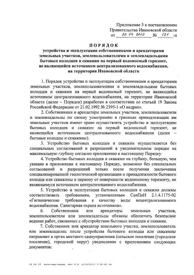 Постановление Правительства Ивановской области от 30.04.2010 N 131-п "О добыче общераспространенных полезных ископаемых собственниками и арендаторами земельных участков, землепользователями, землевладельцами и пользователями недр, а также устройстве бытовых колодцев и скважин на территории Ивановской области" (вместе с "Порядком добычи общераспространенных полезных ископаемых пользователями недр, осуществляющими разведку и добычу иных видов полезных ископаемых или по совмещенной лицензии геологическое изучение, разведку и добычу иных видов полезных ископаемых, на территории Ивановской области", "Порядком добычи общераспространенных полезных ископаемых, не числящихся на государственном балансе, и строительства подземных сооружений для своих нужд собственниками и арендаторами земельных участков, землепользователями и землевладельцами на территории Ивановской области", "Порядком устройства и эксплуатации собственниками и арендаторами земельных участков, землепользователями и землевладельцами бытовых колодцев и скважин на первый водоносный горизонт, не являющийся источником централизованного водоснабжения, на территории Ивановской области")
