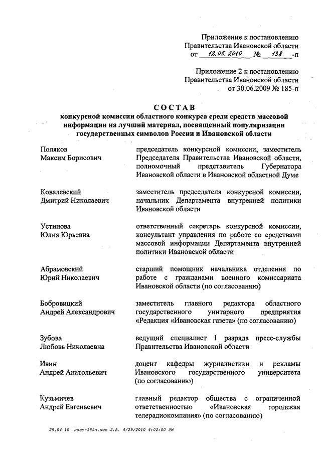 Постановление Правительства Ивановской области от 12.05.2010 N 138-п "О внесении изменений в постановление Правительства Ивановской области от 30.06.2009 N 185-п "Об областном конкурсе среди средств массовой информации на лучший материал, посвященный популяризации государственных символов России и Ивановской области"