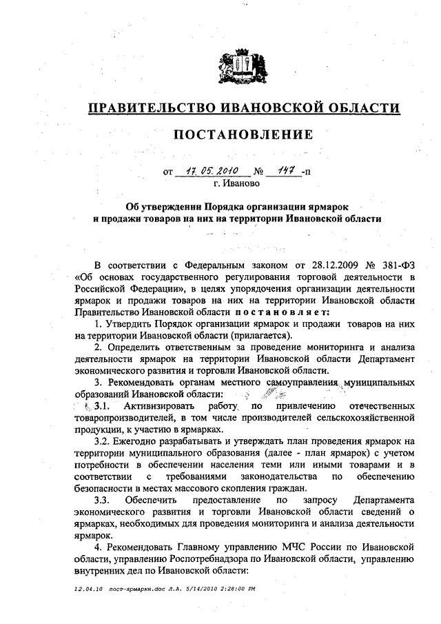 Постановление Правительства Ивановской области от 17.05.2010 N 147-п "Об утверждении Порядка организации ярмарок и продажи товаров на них на территории Ивановской области"