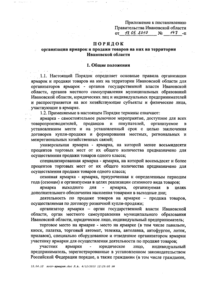 Постановление Правительства Ивановской области от 17.05.2010 N 147-п "Об утверждении Порядка организации ярмарок и продажи товаров на них на территории Ивановской области"
