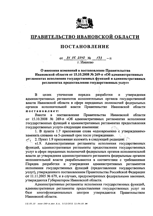 Постановление Правительства Ивановской области от 31.05.2010 N 173-п "О внесении изменений в постановление Правительства Ивановской области от 15.10.2008 N 269-п "Об административных регламентах исполнения государственных функций и административных регламентах предоставления государственных услуг"
