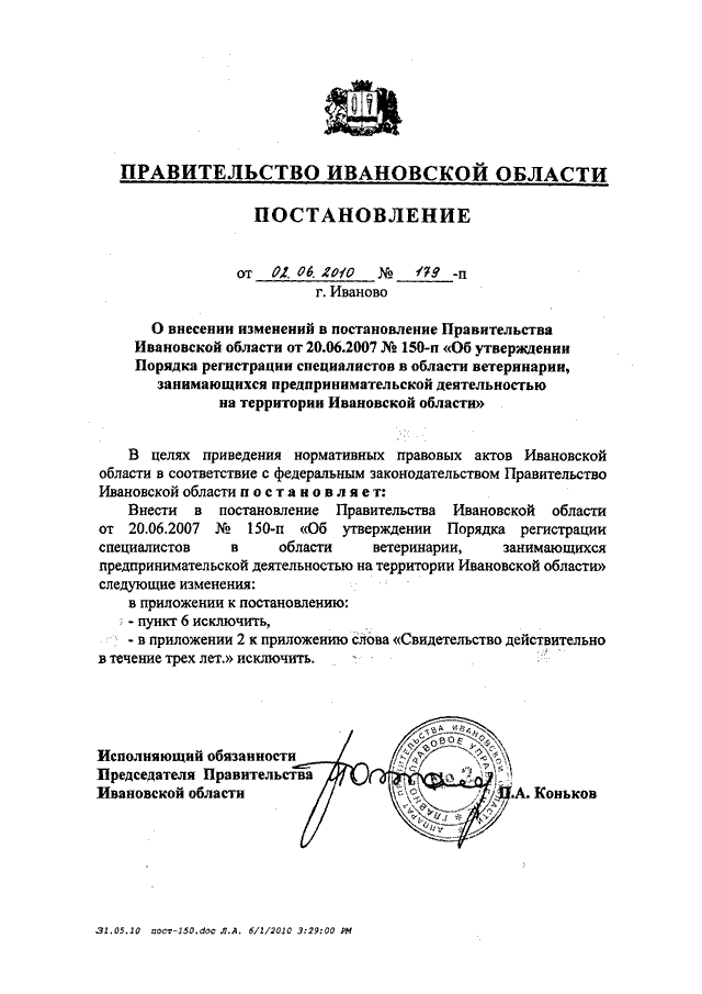 Постановление Правительства Ивановской области от 02.06.2010 N 179-п "О внесении изменений в постановление Правительства Ивановской области от 20.06.2007 N 150-п "Об утверждении Порядка регистрации специалистов в области ветеринарии, занимающихся предпринимательской деятельностью на территории Ивановской области"