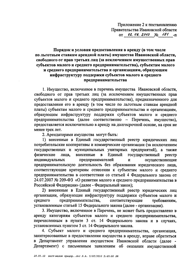 Постановление Правительства Ивановской области от 02.06.2010 N 181-п "О Порядке формирования, ведения, обязательного опубликования перечня имущества Ивановской области, свободного от прав третьих лиц (за исключением имущественных прав субъектов малого и среднего предпринимательства), предназначенного для предоставления его во владение и (или) пользование на долгосрочной основе (в том числе по льготным ставкам арендной платы) субъектам малого и среднего предпринимательства и организациям, образующим инфраструктуру поддержки субъектов малого и среднего предпринимательства, а также порядке и условиях предоставления указанного имущества в аренду (в том числе по льготным ставкам арендной платы) субъектам малого и среднего предпринимательства"