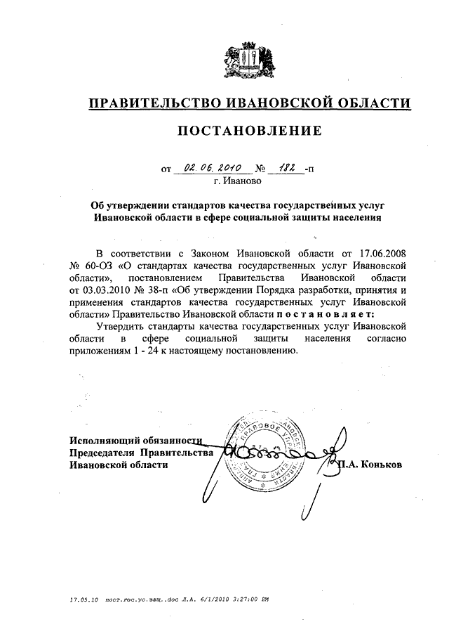 Постановление Правительства Ивановской области от 02.06.2010 N 182-п "Об утверждении стандартов качества государственных услуг Ивановской области в сфере социальной защиты населения" (вместе со "Стандартом качества государственной услуги Ивановской области "Организация предоставления компенсационных выплат гражданам, которым причинен ущерб на финансовом и фондовом рынках Ивановской области", "Стандартом качества государственной услуги "Организация дополнительного пенсионного обеспечения отдельных категорий граждан", "Стандартом качества государственной услуги Ивановской области "Погребение отдельных категорий умерших (которые не работали и не являлись пенсионерами, а также детей, родившихся мертвыми по истечении 196 дней беременности) при отсутствии лиц, взявших на себя обязательства по погребению", "Стандартом качества государственной услуги Ивановской области "Организация социальной работы с семьями и детьми", "Стандартом качества государственной услуги Ивановской области "Содержание, воспитание и начальное профессиональное образование инвалидов и лиц, страдающих хроническими формами заболеваний, в стационарных и полустационарных условиях", "Стандартом качества государственной услуги Ивановской области "Адресная социальная помощь отдельным категориям граждан", "Стандартом качества государственной услуги Ивановской области "Социальное обслуживание граждан пожилого возраста, инвалидов и детей, страдающих хроническими формами заболеваний, в стационарных и полустационарных условиях", "Стандартом качества государственной услуги Ивановской области "Социальное обслуживание лиц без определенного места жительства и занятий в стационарных и полустационарных условиях", "Стандартом качества государственной услуги Ивановской области "Социальное обслуживание граждан пожилого возраста и инвалидов на дому", "Стандартом качества государственной услуги Ивановской области "Временное содержание и социальная реабилитация несовершеннолетних, находящихся в трудной жизненной ситуации", "Стандартом качества государственной услуги Ивановской области "Выдача социальной карты жителя Ивановской области", "Стандартом качества государственной услуги Ивановской области "Организация социальной поддержки отдельных категорий граждан в форме социальных выплат, компенсаций и субсидий", "Стандартом качества государственной услуги Ивановской области "Организация денежных выплат при всех формах устройства в семью детей-сирот и детей, оставшихся без попечения родителей", "Стандартом качества государственной услуги Ивановской области "Оформление и выдача удостоверений гражданам, пострадавшим от радиационного воздействия", "Стандартом качества государственной услуги Ивановской области "Содержание, воспитание и общее образование детей-сирот, детей, оставшихся без попечения родителей, и временное (до одного года) содержание, воспитание и общее образование детей одиноких матерей (отцов), а также детей безработных, беженцев, вынужденных переселенцев, а также из семей, пострадавших от стихийных бедствий и не имеющих постоянного места жительства, в условиях круглосуточного стационара", "Стандартом качества государственной услуги Ивановской области "Назначение опекуна (попечителя) совершеннолетним гражданам, нуждающимся в о