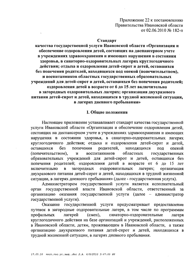Постановление Правительства Ивановской области от 02.06.2010 N 182-п "Об утверждении стандартов качества государственных услуг Ивановской области в сфере социальной защиты населения" (вместе со "Стандартом качества государственной услуги Ивановской области "Организация предоставления компенсационных выплат гражданам, которым причинен ущерб на финансовом и фондовом рынках Ивановской области", "Стандартом качества государственной услуги "Организация дополнительного пенсионного обеспечения отдельных категорий граждан", "Стандартом качества государственной услуги Ивановской области "Погребение отдельных категорий умерших (которые не работали и не являлись пенсионерами, а также детей, родившихся мертвыми по истечении 196 дней беременности) при отсутствии лиц, взявших на себя обязательства по погребению", "Стандартом качества государственной услуги Ивановской области "Организация социальной работы с семьями и детьми", "Стандартом качества государственной услуги Ивановской области "Содержание, воспитание и начальное профессиональное образование инвалидов и лиц, страдающих хроническими формами заболеваний, в стационарных и полустационарных условиях", "Стандартом качества государственной услуги Ивановской области "Адресная социальная помощь отдельным категориям граждан", "Стандартом качества государственной услуги Ивановской области "Социальное обслуживание граждан пожилого возраста, инвалидов и детей, страдающих хроническими формами заболеваний, в стационарных и полустационарных условиях", "Стандартом качества государственной услуги Ивановской области "Социальное обслуживание лиц без определенного места жительства и занятий в стационарных и полустационарных условиях", "Стандартом качества государственной услуги Ивановской области "Социальное обслуживание граждан пожилого возраста и инвалидов на дому", "Стандартом качества государственной услуги Ивановской области "Временное содержание и социальная реабилитация несовершеннолетних, находящихся в трудной жизненной ситуации", "Стандартом качества государственной услуги Ивановской области "Выдача социальной карты жителя Ивановской области", "Стандартом качества государственной услуги Ивановской области "Организация социальной поддержки отдельных категорий граждан в форме социальных выплат, компенсаций и субсидий", "Стандартом качества государственной услуги Ивановской области "Организация денежных выплат при всех формах устройства в семью детей-сирот и детей, оставшихся без попечения родителей", "Стандартом качества государственной услуги Ивановской области "Оформление и выдача удостоверений гражданам, пострадавшим от радиационного воздействия", "Стандартом качества государственной услуги Ивановской области "Содержание, воспитание и общее образование детей-сирот, детей, оставшихся без попечения родителей, и временное (до одного года) содержание, воспитание и общее образование детей одиноких матерей (отцов), а также детей безработных, беженцев, вынужденных переселенцев, а также из семей, пострадавших от стихийных бедствий и не имеющих постоянного места жительства, в условиях круглосуточного стационара", "Стандартом качества государственной услуги Ивановской области "Назначение опекуна (попечителя) совершеннолетним гражданам, нуждающимся в о