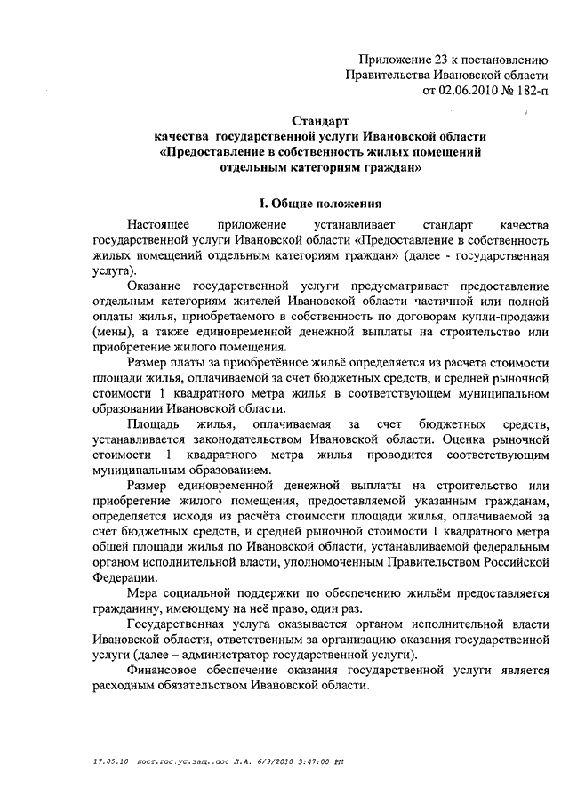 Постановление Правительства Ивановской области от 02.06.2010 N 182-п "Об утверждении стандартов качества государственных услуг Ивановской области в сфере социальной защиты населения" (вместе со "Стандартом качества государственной услуги Ивановской области "Организация предоставления компенсационных выплат гражданам, которым причинен ущерб на финансовом и фондовом рынках Ивановской области", "Стандартом качества государственной услуги "Организация дополнительного пенсионного обеспечения отдельных категорий граждан", "Стандартом качества государственной услуги Ивановской области "Погребение отдельных категорий умерших (которые не работали и не являлись пенсионерами, а также детей, родившихся мертвыми по истечении 196 дней беременности) при отсутствии лиц, взявших на себя обязательства по погребению", "Стандартом качества государственной услуги Ивановской области "Организация социальной работы с семьями и детьми", "Стандартом качества государственной услуги Ивановской области "Содержание, воспитание и начальное профессиональное образование инвалидов и лиц, страдающих хроническими формами заболеваний, в стационарных и полустационарных условиях", "Стандартом качества государственной услуги Ивановской области "Адресная социальная помощь отдельным категориям граждан", "Стандартом качества государственной услуги Ивановской области "Социальное обслуживание граждан пожилого возраста, инвалидов и детей, страдающих хроническими формами заболеваний, в стационарных и полустационарных условиях", "Стандартом качества государственной услуги Ивановской области "Социальное обслуживание лиц без определенного места жительства и занятий в стационарных и полустационарных условиях", "Стандартом качества государственной услуги Ивановской области "Социальное обслуживание граждан пожилого возраста и инвалидов на дому", "Стандартом качества государственной услуги Ивановской области "Временное содержание и социальная реабилитация несовершеннолетних, находящихся в трудной жизненной ситуации", "Стандартом качества государственной услуги Ивановской области "Выдача социальной карты жителя Ивановской области", "Стандартом качества государственной услуги Ивановской области "Организация социальной поддержки отдельных категорий граждан в форме социальных выплат, компенсаций и субсидий", "Стандартом качества государственной услуги Ивановской области "Организация денежных выплат при всех формах устройства в семью детей-сирот и детей, оставшихся без попечения родителей", "Стандартом качества государственной услуги Ивановской области "Оформление и выдача удостоверений гражданам, пострадавшим от радиационного воздействия", "Стандартом качества государственной услуги Ивановской области "Содержание, воспитание и общее образование детей-сирот, детей, оставшихся без попечения родителей, и временное (до одного года) содержание, воспитание и общее образование детей одиноких матерей (отцов), а также детей безработных, беженцев, вынужденных переселенцев, а также из семей, пострадавших от стихийных бедствий и не имеющих постоянного места жительства, в условиях круглосуточного стационара", "Стандартом качества государственной услуги Ивановской области "Назначение опекуна (попечителя) совершеннолетним гражданам, нуждающимся в о