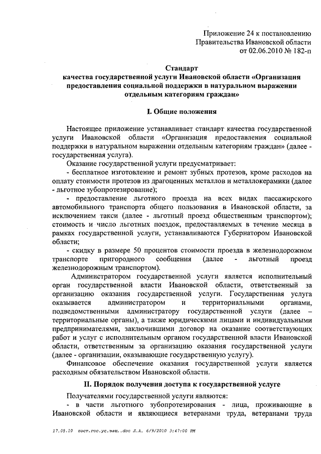 Постановление Правительства Ивановской области от 02.06.2010 N 182-п "Об утверждении стандартов качества государственных услуг Ивановской области в сфере социальной защиты населения" (вместе со "Стандартом качества государственной услуги Ивановской области "Организация предоставления компенсационных выплат гражданам, которым причинен ущерб на финансовом и фондовом рынках Ивановской области", "Стандартом качества государственной услуги "Организация дополнительного пенсионного обеспечения отдельных категорий граждан", "Стандартом качества государственной услуги Ивановской области "Погребение отдельных категорий умерших (которые не работали и не являлись пенсионерами, а также детей, родившихся мертвыми по истечении 196 дней беременности) при отсутствии лиц, взявших на себя обязательства по погребению", "Стандартом качества государственной услуги Ивановской области "Организация социальной работы с семьями и детьми", "Стандартом качества государственной услуги Ивановской области "Содержание, воспитание и начальное профессиональное образование инвалидов и лиц, страдающих хроническими формами заболеваний, в стационарных и полустационарных условиях", "Стандартом качества государственной услуги Ивановской области "Адресная социальная помощь отдельным категориям граждан", "Стандартом качества государственной услуги Ивановской области "Социальное обслуживание граждан пожилого возраста, инвалидов и детей, страдающих хроническими формами заболеваний, в стационарных и полустационарных условиях", "Стандартом качества государственной услуги Ивановской области "Социальное обслуживание лиц без определенного места жительства и занятий в стационарных и полустационарных условиях", "Стандартом качества государственной услуги Ивановской области "Социальное обслуживание граждан пожилого возраста и инвалидов на дому", "Стандартом качества государственной услуги Ивановской области "Временное содержание и социальная реабилитация несовершеннолетних, находящихся в трудной жизненной ситуации", "Стандартом качества государственной услуги Ивановской области "Выдача социальной карты жителя Ивановской области", "Стандартом качества государственной услуги Ивановской области "Организация социальной поддержки отдельных категорий граждан в форме социальных выплат, компенсаций и субсидий", "Стандартом качества государственной услуги Ивановской области "Организация денежных выплат при всех формах устройства в семью детей-сирот и детей, оставшихся без попечения родителей", "Стандартом качества государственной услуги Ивановской области "Оформление и выдача удостоверений гражданам, пострадавшим от радиационного воздействия", "Стандартом качества государственной услуги Ивановской области "Содержание, воспитание и общее образование детей-сирот, детей, оставшихся без попечения родителей, и временное (до одного года) содержание, воспитание и общее образование детей одиноких матерей (отцов), а также детей безработных, беженцев, вынужденных переселенцев, а также из семей, пострадавших от стихийных бедствий и не имеющих постоянного места жительства, в условиях круглосуточного стационара", "Стандартом качества государственной услуги Ивановской области "Назначение опекуна (попечителя) совершеннолетним гражданам, нуждающимся в о