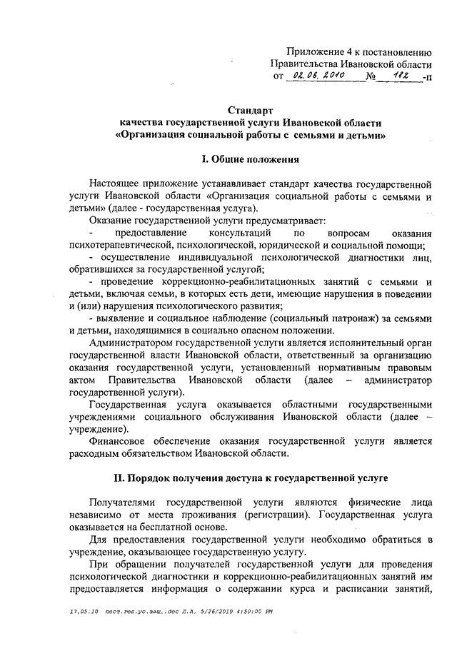 Постановление Правительства Ивановской области от 02.06.2010 N 182-п "Об утверждении стандартов качества государственных услуг Ивановской области в сфере социальной защиты населения" (вместе со "Стандартом качества государственной услуги Ивановской области "Организация предоставления компенсационных выплат гражданам, которым причинен ущерб на финансовом и фондовом рынках Ивановской области", "Стандартом качества государственной услуги "Организация дополнительного пенсионного обеспечения отдельных категорий граждан", "Стандартом качества государственной услуги Ивановской области "Погребение отдельных категорий умерших (которые не работали и не являлись пенсионерами, а также детей, родившихся мертвыми по истечении 196 дней беременности) при отсутствии лиц, взявших на себя обязательства по погребению", "Стандартом качества государственной услуги Ивановской области "Организация социальной работы с семьями и детьми", "Стандартом качества государственной услуги Ивановской области "Содержание, воспитание и начальное профессиональное образование инвалидов и лиц, страдающих хроническими формами заболеваний, в стационарных и полустационарных условиях", "Стандартом качества государственной услуги Ивановской области "Адресная социальная помощь отдельным категориям граждан", "Стандартом качества государственной услуги Ивановской области "Социальное обслуживание граждан пожилого возраста, инвалидов и детей, страдающих хроническими формами заболеваний, в стационарных и полустационарных условиях", "Стандартом качества государственной услуги Ивановской области "Социальное обслуживание лиц без определенного места жительства и занятий в стационарных и полустационарных условиях", "Стандартом качества государственной услуги Ивановской области "Социальное обслуживание граждан пожилого возраста и инвалидов на дому", "Стандартом качества государственной услуги Ивановской области "Временное содержание и социальная реабилитация несовершеннолетних, находящихся в трудной жизненной ситуации", "Стандартом качества государственной услуги Ивановской области "Выдача социальной карты жителя Ивановской области", "Стандартом качества государственной услуги Ивановской области "Организация социальной поддержки отдельных категорий граждан в форме социальных выплат, компенсаций и субсидий", "Стандартом качества государственной услуги Ивановской области "Организация денежных выплат при всех формах устройства в семью детей-сирот и детей, оставшихся без попечения родителей", "Стандартом качества государственной услуги Ивановской области "Оформление и выдача удостоверений гражданам, пострадавшим от радиационного воздействия", "Стандартом качества государственной услуги Ивановской области "Содержание, воспитание и общее образование детей-сирот, детей, оставшихся без попечения родителей, и временное (до одного года) содержание, воспитание и общее образование детей одиноких матерей (отцов), а также детей безработных, беженцев, вынужденных переселенцев, а также из семей, пострадавших от стихийных бедствий и не имеющих постоянного места жительства, в условиях круглосуточного стационара", "Стандартом качества государственной услуги Ивановской области "Назначение опекуна (попечителя) совершеннолетним гражданам, нуждающимся в о