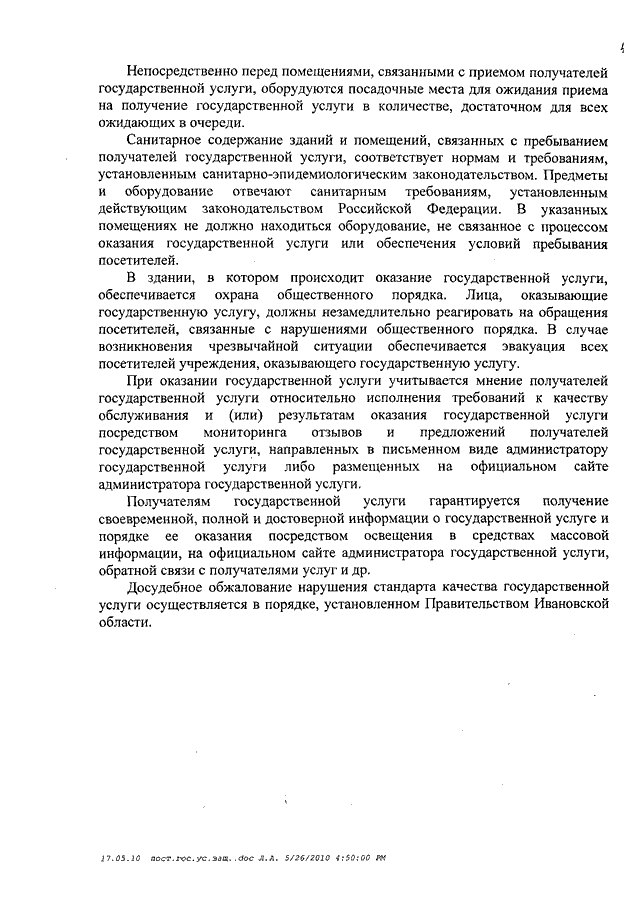 Постановление Правительства Ивановской области от 02.06.2010 N 182-п "Об утверждении стандартов качества государственных услуг Ивановской области в сфере социальной защиты населения" (вместе со "Стандартом качества государственной услуги Ивановской области "Организация предоставления компенсационных выплат гражданам, которым причинен ущерб на финансовом и фондовом рынках Ивановской области", "Стандартом качества государственной услуги "Организация дополнительного пенсионного обеспечения отдельных категорий граждан", "Стандартом качества государственной услуги Ивановской области "Погребение отдельных категорий умерших (которые не работали и не являлись пенсионерами, а также детей, родившихся мертвыми по истечении 196 дней беременности) при отсутствии лиц, взявших на себя обязательства по погребению", "Стандартом качества государственной услуги Ивановской области "Организация социальной работы с семьями и детьми", "Стандартом качества государственной услуги Ивановской области "Содержание, воспитание и начальное профессиональное образование инвалидов и лиц, страдающих хроническими формами заболеваний, в стационарных и полустационарных условиях", "Стандартом качества государственной услуги Ивановской области "Адресная социальная помощь отдельным категориям граждан", "Стандартом качества государственной услуги Ивановской области "Социальное обслуживание граждан пожилого возраста, инвалидов и детей, страдающих хроническими формами заболеваний, в стационарных и полустационарных условиях", "Стандартом качества государственной услуги Ивановской области "Социальное обслуживание лиц без определенного места жительства и занятий в стационарных и полустационарных условиях", "Стандартом качества государственной услуги Ивановской области "Социальное обслуживание граждан пожилого возраста и инвалидов на дому", "Стандартом качества государственной услуги Ивановской области "Временное содержание и социальная реабилитация несовершеннолетних, находящихся в трудной жизненной ситуации", "Стандартом качества государственной услуги Ивановской области "Выдача социальной карты жителя Ивановской области", "Стандартом качества государственной услуги Ивановской области "Организация социальной поддержки отдельных категорий граждан в форме социальных выплат, компенсаций и субсидий", "Стандартом качества государственной услуги Ивановской области "Организация денежных выплат при всех формах устройства в семью детей-сирот и детей, оставшихся без попечения родителей", "Стандартом качества государственной услуги Ивановской области "Оформление и выдача удостоверений гражданам, пострадавшим от радиационного воздействия", "Стандартом качества государственной услуги Ивановской области "Содержание, воспитание и общее образование детей-сирот, детей, оставшихся без попечения родителей, и временное (до одного года) содержание, воспитание и общее образование детей одиноких матерей (отцов), а также детей безработных, беженцев, вынужденных переселенцев, а также из семей, пострадавших от стихийных бедствий и не имеющих постоянного места жительства, в условиях круглосуточного стационара", "Стандартом качества государственной услуги Ивановской области "Назначение опекуна (попечителя) совершеннолетним гражданам, нуждающимся в о