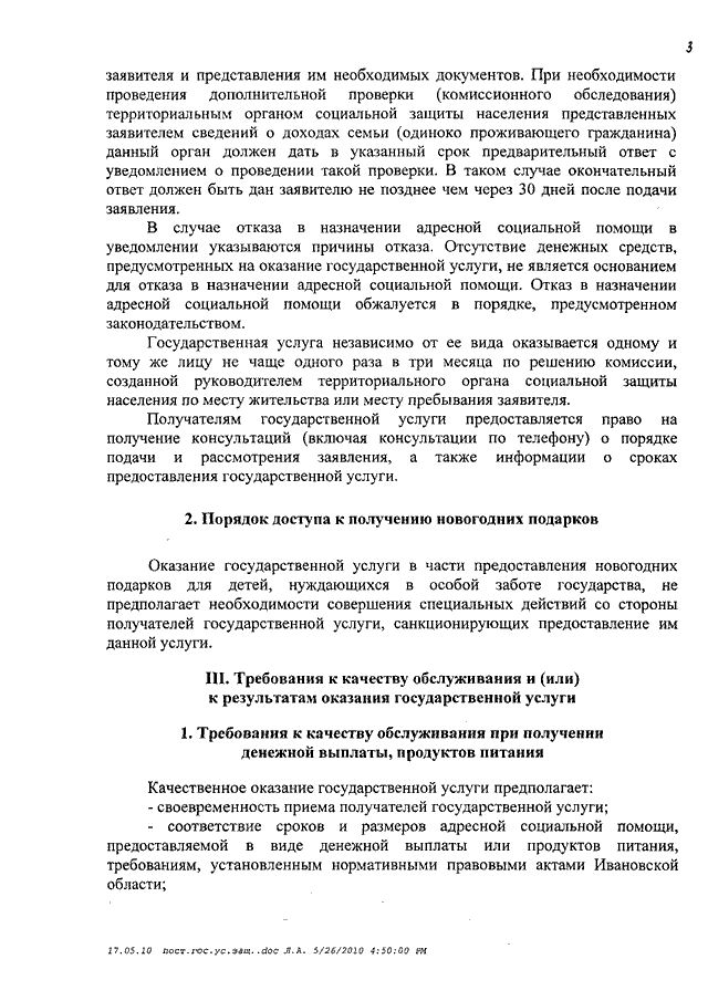 Постановление Правительства Ивановской области от 02.06.2010 N 182-п "Об утверждении стандартов качества государственных услуг Ивановской области в сфере социальной защиты населения" (вместе со "Стандартом качества государственной услуги Ивановской области "Организация предоставления компенсационных выплат гражданам, которым причинен ущерб на финансовом и фондовом рынках Ивановской области", "Стандартом качества государственной услуги "Организация дополнительного пенсионного обеспечения отдельных категорий граждан", "Стандартом качества государственной услуги Ивановской области "Погребение отдельных категорий умерших (которые не работали и не являлись пенсионерами, а также детей, родившихся мертвыми по истечении 196 дней беременности) при отсутствии лиц, взявших на себя обязательства по погребению", "Стандартом качества государственной услуги Ивановской области "Организация социальной работы с семьями и детьми", "Стандартом качества государственной услуги Ивановской области "Содержание, воспитание и начальное профессиональное образование инвалидов и лиц, страдающих хроническими формами заболеваний, в стационарных и полустационарных условиях", "Стандартом качества государственной услуги Ивановской области "Адресная социальная помощь отдельным категориям граждан", "Стандартом качества государственной услуги Ивановской области "Социальное обслуживание граждан пожилого возраста, инвалидов и детей, страдающих хроническими формами заболеваний, в стационарных и полустационарных условиях", "Стандартом качества государственной услуги Ивановской области "Социальное обслуживание лиц без определенного места жительства и занятий в стационарных и полустационарных условиях", "Стандартом качества государственной услуги Ивановской области "Социальное обслуживание граждан пожилого возраста и инвалидов на дому", "Стандартом качества государственной услуги Ивановской области "Временное содержание и социальная реабилитация несовершеннолетних, находящихся в трудной жизненной ситуации", "Стандартом качества государственной услуги Ивановской области "Выдача социальной карты жителя Ивановской области", "Стандартом качества государственной услуги Ивановской области "Организация социальной поддержки отдельных категорий граждан в форме социальных выплат, компенсаций и субсидий", "Стандартом качества государственной услуги Ивановской области "Организация денежных выплат при всех формах устройства в семью детей-сирот и детей, оставшихся без попечения родителей", "Стандартом качества государственной услуги Ивановской области "Оформление и выдача удостоверений гражданам, пострадавшим от радиационного воздействия", "Стандартом качества государственной услуги Ивановской области "Содержание, воспитание и общее образование детей-сирот, детей, оставшихся без попечения родителей, и временное (до одного года) содержание, воспитание и общее образование детей одиноких матерей (отцов), а также детей безработных, беженцев, вынужденных переселенцев, а также из семей, пострадавших от стихийных бедствий и не имеющих постоянного места жительства, в условиях круглосуточного стационара", "Стандартом качества государственной услуги Ивановской области "Назначение опекуна (попечителя) совершеннолетним гражданам, нуждающимся в о