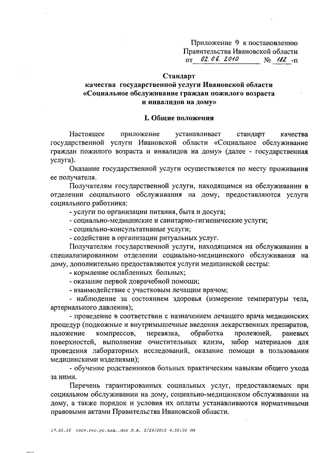 Постановление Правительства Ивановской области от 02.06.2010 N 182-п "Об утверждении стандартов качества государственных услуг Ивановской области в сфере социальной защиты населения" (вместе со "Стандартом качества государственной услуги Ивановской области "Организация предоставления компенсационных выплат гражданам, которым причинен ущерб на финансовом и фондовом рынках Ивановской области", "Стандартом качества государственной услуги "Организация дополнительного пенсионного обеспечения отдельных категорий граждан", "Стандартом качества государственной услуги Ивановской области "Погребение отдельных категорий умерших (которые не работали и не являлись пенсионерами, а также детей, родившихся мертвыми по истечении 196 дней беременности) при отсутствии лиц, взявших на себя обязательства по погребению", "Стандартом качества государственной услуги Ивановской области "Организация социальной работы с семьями и детьми", "Стандартом качества государственной услуги Ивановской области "Содержание, воспитание и начальное профессиональное образование инвалидов и лиц, страдающих хроническими формами заболеваний, в стационарных и полустационарных условиях", "Стандартом качества государственной услуги Ивановской области "Адресная социальная помощь отдельным категориям граждан", "Стандартом качества государственной услуги Ивановской области "Социальное обслуживание граждан пожилого возраста, инвалидов и детей, страдающих хроническими формами заболеваний, в стационарных и полустационарных условиях", "Стандартом качества государственной услуги Ивановской области "Социальное обслуживание лиц без определенного места жительства и занятий в стационарных и полустационарных условиях", "Стандартом качества государственной услуги Ивановской области "Социальное обслуживание граждан пожилого возраста и инвалидов на дому", "Стандартом качества государственной услуги Ивановской области "Временное содержание и социальная реабилитация несовершеннолетних, находящихся в трудной жизненной ситуации", "Стандартом качества государственной услуги Ивановской области "Выдача социальной карты жителя Ивановской области", "Стандартом качества государственной услуги Ивановской области "Организация социальной поддержки отдельных категорий граждан в форме социальных выплат, компенсаций и субсидий", "Стандартом качества государственной услуги Ивановской области "Организация денежных выплат при всех формах устройства в семью детей-сирот и детей, оставшихся без попечения родителей", "Стандартом качества государственной услуги Ивановской области "Оформление и выдача удостоверений гражданам, пострадавшим от радиационного воздействия", "Стандартом качества государственной услуги Ивановской области "Содержание, воспитание и общее образование детей-сирот, детей, оставшихся без попечения родителей, и временное (до одного года) содержание, воспитание и общее образование детей одиноких матерей (отцов), а также детей безработных, беженцев, вынужденных переселенцев, а также из семей, пострадавших от стихийных бедствий и не имеющих постоянного места жительства, в условиях круглосуточного стационара", "Стандартом качества государственной услуги Ивановской области "Назначение опекуна (попечителя) совершеннолетним гражданам, нуждающимся в о