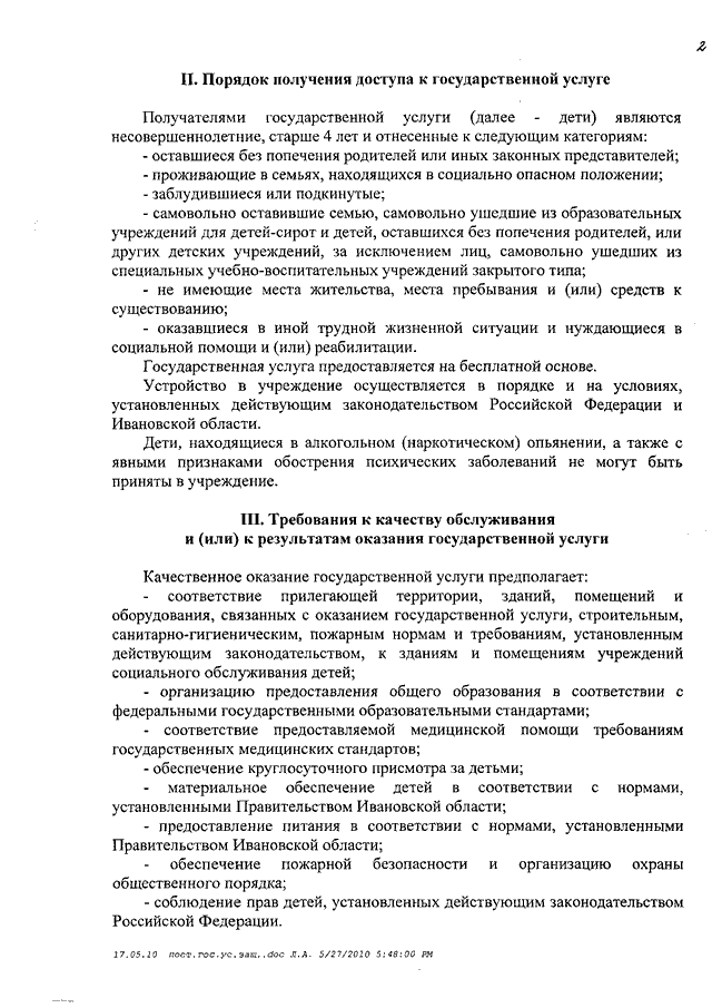 Постановление Правительства Ивановской области от 02.06.2010 N 182-п "Об утверждении стандартов качества государственных услуг Ивановской области в сфере социальной защиты населения" (вместе со "Стандартом качества государственной услуги Ивановской области "Организация предоставления компенсационных выплат гражданам, которым причинен ущерб на финансовом и фондовом рынках Ивановской области", "Стандартом качества государственной услуги "Организация дополнительного пенсионного обеспечения отдельных категорий граждан", "Стандартом качества государственной услуги Ивановской области "Погребение отдельных категорий умерших (которые не работали и не являлись пенсионерами, а также детей, родившихся мертвыми по истечении 196 дней беременности) при отсутствии лиц, взявших на себя обязательства по погребению", "Стандартом качества государственной услуги Ивановской области "Организация социальной работы с семьями и детьми", "Стандартом качества государственной услуги Ивановской области "Содержание, воспитание и начальное профессиональное образование инвалидов и лиц, страдающих хроническими формами заболеваний, в стационарных и полустационарных условиях", "Стандартом качества государственной услуги Ивановской области "Адресная социальная помощь отдельным категориям граждан", "Стандартом качества государственной услуги Ивановской области "Социальное обслуживание граждан пожилого возраста, инвалидов и детей, страдающих хроническими формами заболеваний, в стационарных и полустационарных условиях", "Стандартом качества государственной услуги Ивановской области "Социальное обслуживание лиц без определенного места жительства и занятий в стационарных и полустационарных условиях", "Стандартом качества государственной услуги Ивановской области "Социальное обслуживание граждан пожилого возраста и инвалидов на дому", "Стандартом качества государственной услуги Ивановской области "Временное содержание и социальная реабилитация несовершеннолетних, находящихся в трудной жизненной ситуации", "Стандартом качества государственной услуги Ивановской области "Выдача социальной карты жителя Ивановской области", "Стандартом качества государственной услуги Ивановской области "Организация социальной поддержки отдельных категорий граждан в форме социальных выплат, компенсаций и субсидий", "Стандартом качества государственной услуги Ивановской области "Организация денежных выплат при всех формах устройства в семью детей-сирот и детей, оставшихся без попечения родителей", "Стандартом качества государственной услуги Ивановской области "Оформление и выдача удостоверений гражданам, пострадавшим от радиационного воздействия", "Стандартом качества государственной услуги Ивановской области "Содержание, воспитание и общее образование детей-сирот, детей, оставшихся без попечения родителей, и временное (до одного года) содержание, воспитание и общее образование детей одиноких матерей (отцов), а также детей безработных, беженцев, вынужденных переселенцев, а также из семей, пострадавших от стихийных бедствий и не имеющих постоянного места жительства, в условиях круглосуточного стационара", "Стандартом качества государственной услуги Ивановской области "Назначение опекуна (попечителя) совершеннолетним гражданам, нуждающимся в о
