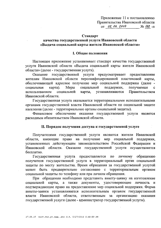 Постановление Правительства Ивановской области от 02.06.2010 N 182-п "Об утверждении стандартов качества государственных услуг Ивановской области в сфере социальной защиты населения" (вместе со "Стандартом качества государственной услуги Ивановской области "Организация предоставления компенсационных выплат гражданам, которым причинен ущерб на финансовом и фондовом рынках Ивановской области", "Стандартом качества государственной услуги "Организация дополнительного пенсионного обеспечения отдельных категорий граждан", "Стандартом качества государственной услуги Ивановской области "Погребение отдельных категорий умерших (которые не работали и не являлись пенсионерами, а также детей, родившихся мертвыми по истечении 196 дней беременности) при отсутствии лиц, взявших на себя обязательства по погребению", "Стандартом качества государственной услуги Ивановской области "Организация социальной работы с семьями и детьми", "Стандартом качества государственной услуги Ивановской области "Содержание, воспитание и начальное профессиональное образование инвалидов и лиц, страдающих хроническими формами заболеваний, в стационарных и полустационарных условиях", "Стандартом качества государственной услуги Ивановской области "Адресная социальная помощь отдельным категориям граждан", "Стандартом качества государственной услуги Ивановской области "Социальное обслуживание граждан пожилого возраста, инвалидов и детей, страдающих хроническими формами заболеваний, в стационарных и полустационарных условиях", "Стандартом качества государственной услуги Ивановской области "Социальное обслуживание лиц без определенного места жительства и занятий в стационарных и полустационарных условиях", "Стандартом качества государственной услуги Ивановской области "Социальное обслуживание граждан пожилого возраста и инвалидов на дому", "Стандартом качества государственной услуги Ивановской области "Временное содержание и социальная реабилитация несовершеннолетних, находящихся в трудной жизненной ситуации", "Стандартом качества государственной услуги Ивановской области "Выдача социальной карты жителя Ивановской области", "Стандартом качества государственной услуги Ивановской области "Организация социальной поддержки отдельных категорий граждан в форме социальных выплат, компенсаций и субсидий", "Стандартом качества государственной услуги Ивановской области "Организация денежных выплат при всех формах устройства в семью детей-сирот и детей, оставшихся без попечения родителей", "Стандартом качества государственной услуги Ивановской области "Оформление и выдача удостоверений гражданам, пострадавшим от радиационного воздействия", "Стандартом качества государственной услуги Ивановской области "Содержание, воспитание и общее образование детей-сирот, детей, оставшихся без попечения родителей, и временное (до одного года) содержание, воспитание и общее образование детей одиноких матерей (отцов), а также детей безработных, беженцев, вынужденных переселенцев, а также из семей, пострадавших от стихийных бедствий и не имеющих постоянного места жительства, в условиях круглосуточного стационара", "Стандартом качества государственной услуги Ивановской области "Назначение опекуна (попечителя) совершеннолетним гражданам, нуждающимся в о